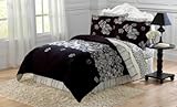 Night Blossom Queen Bed in a Bag - Black (NEW in Original Packaging) Transform your boudoir into a lush and lovely private sanctuary with this captivating Night Blossom complete bedroom ensemble! The face of the comforter and the standard flanged pillow shams features a hugely scaled stencil floral design in black and white on a midnight black ground; the comforter highlights a wide band of the floral pattern accented with tossed floral accents while the shams feature an all over tossed design. The comforter reverses to solid black. The coordinating, all cotton 200 thread count sheet set features an all over pattern of tiny stylized floral and leaf motifs in black on a white ground, accented by a wide white hem treatment and black piping. The coordinating bed skirt features a vertical thick and thin pencil stripe design in black and white. All components are constructed of luscious 100% cotton fabric and are machine washable.